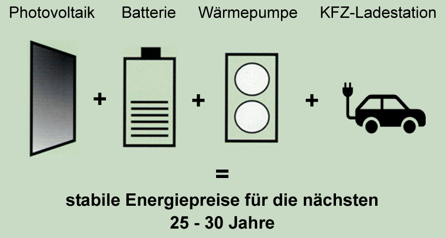 Mit der Kombination aus einer Photovoltaik-Anlage zur Stromerzeugung, einer Batterie zur Zwischenspeicherung des selbst produzierten Stroms, einer Wärmepumpe zur Nutzung der natürlich vorkommenden und kostenlos verfügbaren Wärmeenergie sowie einer KFZ-Ladestation haben Sie stabile Energiepreise für die nächsten 25 - 30 Jahre.